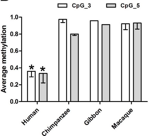 最近,中科院昆明动物研究所宿兵研究员实验室(助理研究员石磊与博士研究生林强)对4个大脑容量调控关键基因(ASPM、CDK5RAP2、CENPJ和MCPH1)上游非翻译区(5’-UTR)的甲基化模式进行了系统的分析。他们通过亚硫酸氢盐测序比较了4个灵长类代表物种(人类、黑猩猩、长臂猿和猕猴)大脑前额叶中这4个基因的甲基化模式的差异。研究结果发现,CENPJ基因在人类大脑中是低甲基化的,而在其他所有非人灵长类大脑中的甲基化水平是人类的2-3倍;理论上,低甲基化往往对应高的基因转录活性。如预期的一样,他们在人的大脑中检测到比非人灵长类高得多的CENPJ的表达。因此,在人类大脑中CENPJ的低甲基化和高表达提示这一人类特异的表观遗传变化可能是伴随人类起源而发生的,并且是可遗传的。