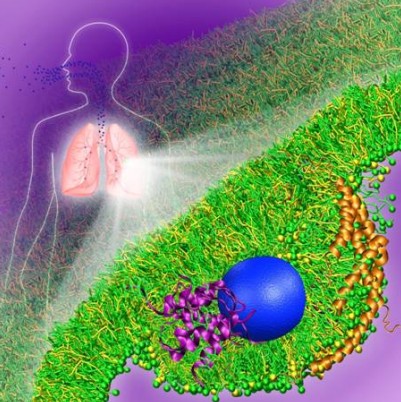 图1 因其细小尺度,很大部分吸入纳米颗粒将沉积到肺泡附近,并与肺表面活性剂发生相互作用。