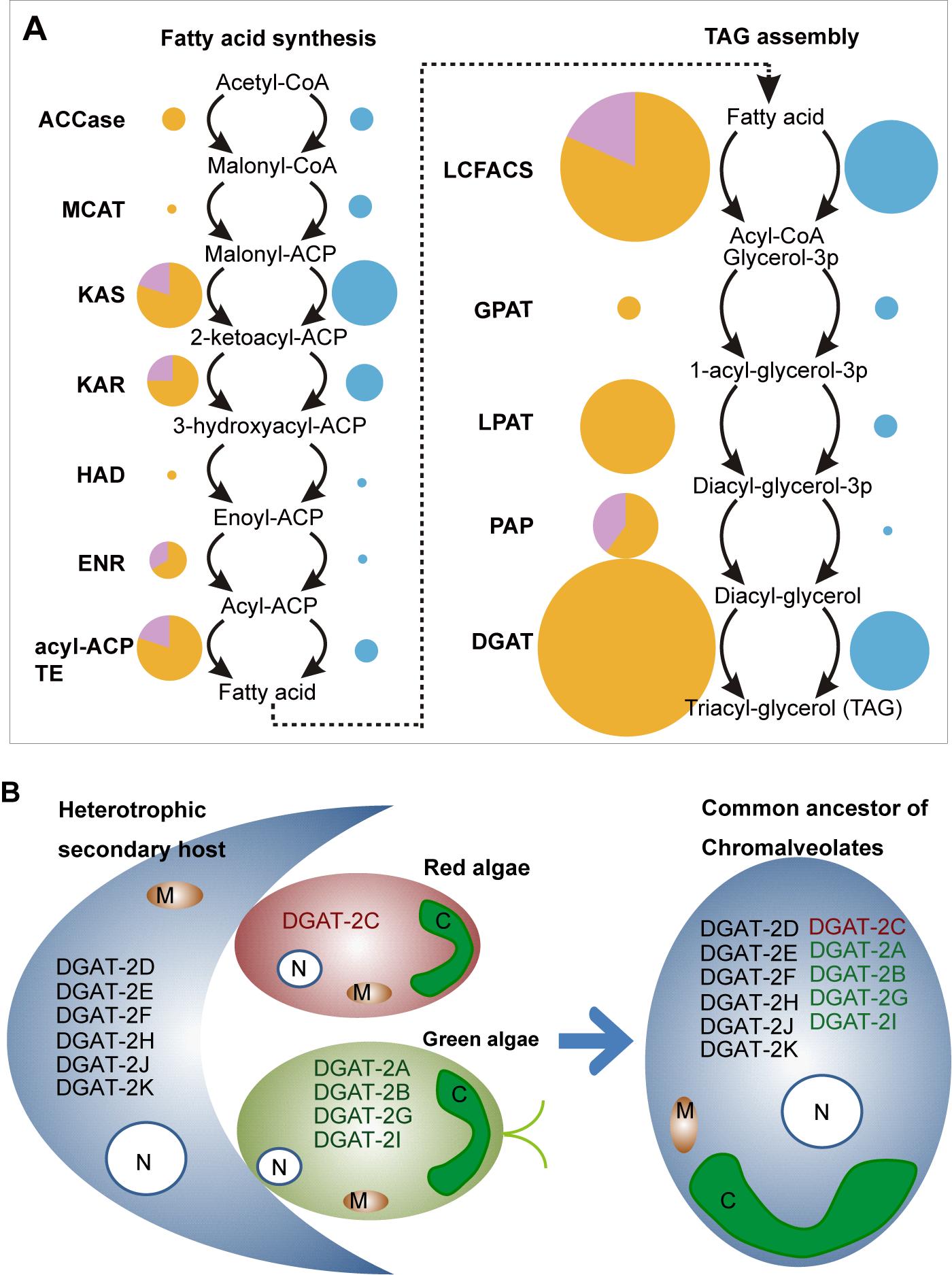微拟球藻是一种在海洋中广泛分布,且在世界各地均可规模培养的野生高产油藻。青岛能源所单细胞研究中心功能基因组团队王冬梅、宁康和博士研究生李敬等通过对分属五个种系的六个微拟球藻藻株的基因组解析和比较,发现在脂肪酸合成和甘油三酯(TAG)组装途径上的多个关键功能酶基因的拷贝数显著增多(gene dose expansion),且这种特定代谢节点的基因数膨胀在不同微拟球藻藻株中普遍存在。这构成了微拟球藻高效合成TAG的遗传基础(图A)。