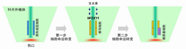 这项研究发展了一套研究根从头再生的方法。将模式植物拟南芥的离体叶片放置于不添加外源激素的B5培养基,完全依靠离体叶片内源激素再生出不定根。研究者观察到离体叶片中内源生长素迅速聚集在伤口附近的原形成层中,并激活了WOX11转录因子基因的表达,促使发生“第一步细胞命运转变”,即叶原形成层细胞转变为根母细胞。接着,WOX11激活了LBD基因的表达,促使细胞分裂并发生“第二次细胞命运转变”,即从根母细胞转变为根原基细胞。这两步细胞命运转变完成了叶片的原形成层干细胞转变为不定根原基,实现了再生。另外,此项研究还证实,叶片再生愈伤组织的过程与根从头再生过程极为类似,愈伤组织的细胞学本质是一团在外源激素刺激下快速分裂的根原基。