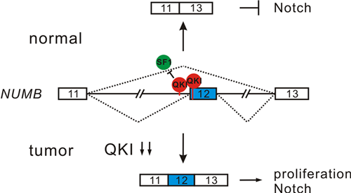 该研究工作在肺癌细胞中发现QKI是一种新的关键剪接调控因子和一种潜在的早期肺癌预后标记,并首次提出由QKI/NUMB/Notch通路调控肿瘤增殖的新机制。