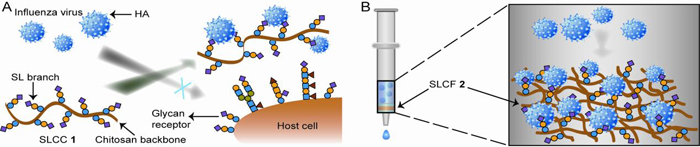 图1. 水溶性病毒感染抑制剂SLCC 1(A)和流感病毒吸附材料SLCF 2(B)
