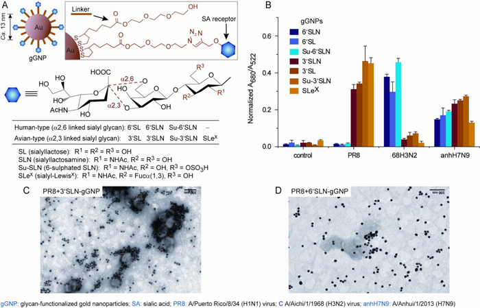 图2. 唾液酸寡糖修饰的纳米粒子gGNP(A),对3种流感病毒的受体特异性的检测结果(B),α2,3型gGNP与病毒PR8特异性结合并聚集在病毒周围(C),α2,6型gGNP则与PR8无反应(D)