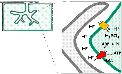 在植物丛枝菌根共生中,丛枝菌根真菌能够富集土壤中的磷、氮等营养,传递给植物供其生长;同时植物提供碳源供丛枝菌根真菌生长。前人的研究发现多个磷转运蛋白和氮转运蛋白负责植物与丛枝菌根真菌之间营养转运,而磷转运蛋白是一类H+离子梯度依赖型的转运蛋白,但在植物-丛枝菌根共生中H+离子梯度的产生和维持还不清楚。王二涛研究组利用正向和反向遗传学,获得了水稻和苜蓿中特异被丛枝菌根真菌诱导的H+-ATPases,并发现突变体不能通过丛枝菌根共生获得磷营养,表现为丛枝菌根共生缺失。这是目前发现的首个有活性的H+-ATPase参与菌根共生,通过产生和维持细胞内外H+离子梯度而驱动植物与菌根真菌之间的营养交换。英国约克大学的研究人员也参与了该项目研究。