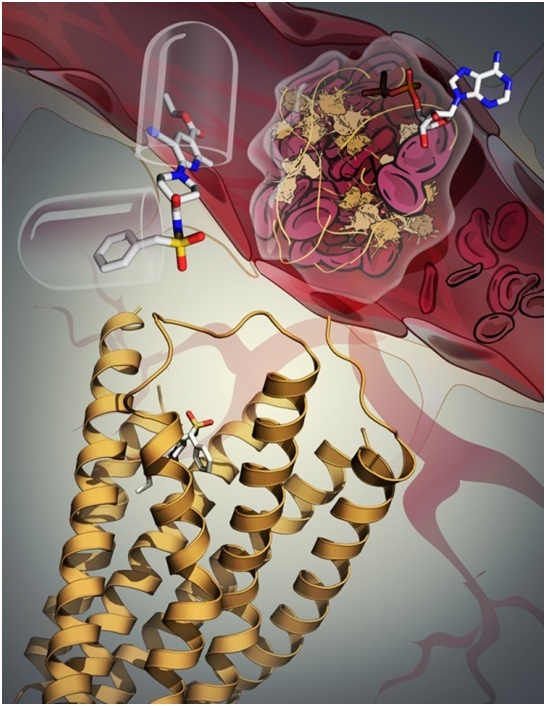 血栓性疾病包括中风、冠心病、肺栓塞等各种疾病,是严重威胁人类的生命健康、致死致残的重要疾病之一。数据统计,血栓性疾病占人类疾病死亡率的51%以上。目前,我国血栓性疾病患者超过1千万,发病率远高于其他疾病,且有逐年递增的趋势。在血栓性疾病的发病过程中,嘌呤能受体P2Y12R是刺激血栓形成的重要因子,阻断P2Y12R受体能防止血液凝固,因此其阻断剂也是当代医学研究的重点和热点之一。当前,市场上靶向该受体的药物年销售额可达数十亿美元。但是,这些药物都存在一定的副作用或者不足,例如第二代药物对1/3病人无效,而第四代P2Y12R受体阻断剂可能导致病人呼吸困难等。
