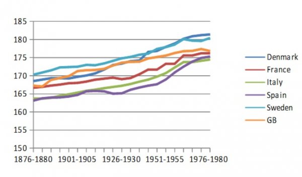 增长了10cm看起来很厉害。但是这不仅仅发生在英国,西方各国的平均身高都差不多高了这么多,就是有快有慢。稍早些时候,丹麦人和西班牙人长高了13cm,而意大利人和瑞典人长高了10cm。