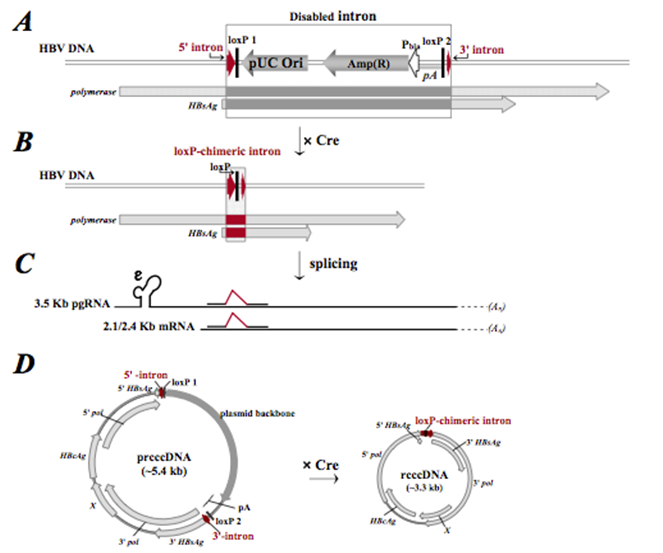 A-C:重组诱导外源内含子的剪切,但不影响HBV读码框的转录和翻译;D: 在重组酶Cre的诱导下,单拷贝的HBV rcccDNA的产生。