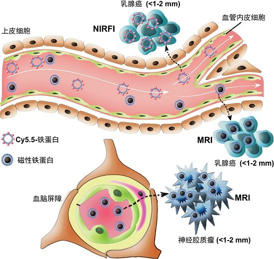 能跨越体内屏障和诊断微小肿瘤的核磁共振成像和近红外荧光成像造影剂工作原理示意图