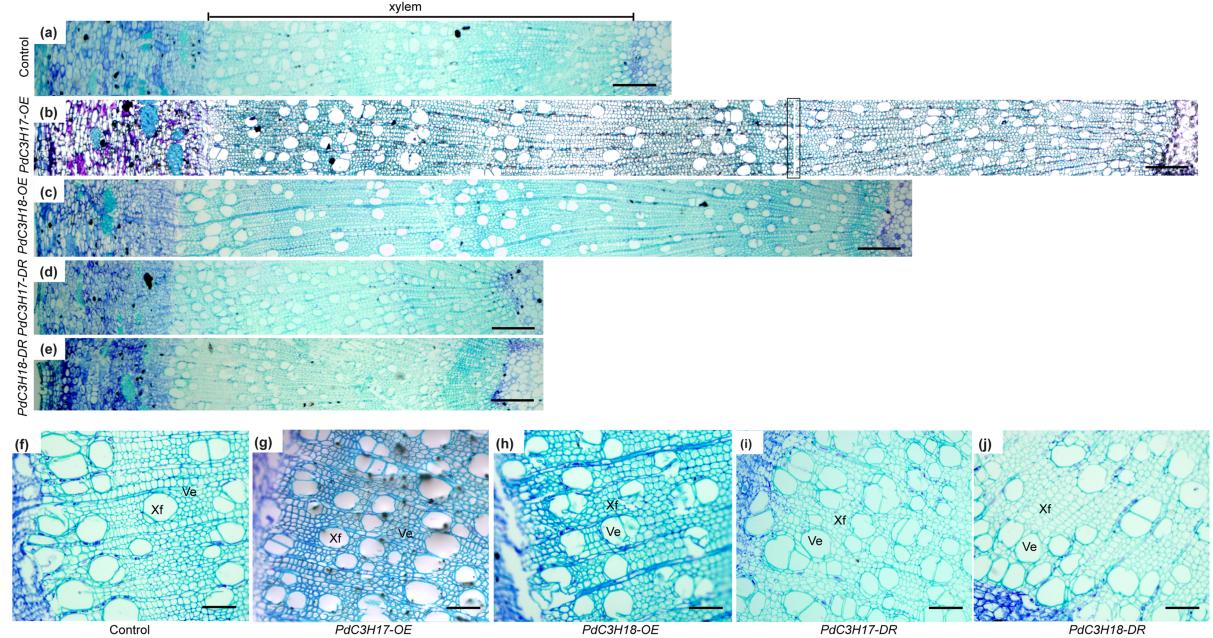 过表达和显性抑制杨树PdC3H17和 PdC3H18基因对茎秆木质部发育的影响。显微镜下观察温室生长6个月植株的茎秆横切面。过表达PdC3H17和 PdC3H18基因导致茎秆木质部增粗,细胞壁增厚;显性抑制这两个基因产生相反的表型。过表达植株:PdC3H17-OE, PdC3H18-OE;显性抑制植株:PdC3H17-DR, PdC3H18-DR。xf, 木质纤维; ve, 导管。Bars: (a–e) 200 um; (f–j) 50 um。