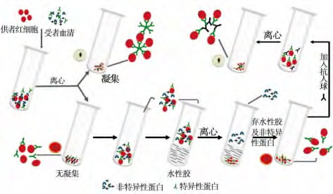 针对这一难题,中国科学院苏州生物医学工程技术研究所李勇研究员所带领的血液免疫学与免疫遗传学课题组建立了水性胶层析改良抗球蛋白试验(HCI-Coombs T)方法,通过将含红细胞和血清的反应液置于水性胶介质试管中,低速离心使红细胞穿过水性胶到达试管底部,而血清中非特异性球蛋白等滞留在水性胶之上,弃去反应液和水性胶介质后加入抗人球蛋白试剂,离心后观察血凝结果(如图)。