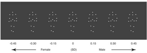 中国科学院心理研究所周雯研究组和蒋毅研究组合作,就雄甾二烯酮和雌甾四烯可否在个体间有效传递性别信息展开了研究。实验招募了异性恋者和同性恋者共计96名,男女各半,请他们观看在屏幕上行走的光点小人,并判断其性别(图1)。每个光点小人由15个点组成:其中12个表示人体的主要关节,另外3个分别代表盆骨、胸部以及头部;每个光点小人的行走步态介于稍偏男性化至稍偏女性化之间。受试者在连续三天的相同时间段参加实验,每天的实验任务相同,但与任务伴随呈现的嗅觉刺激不同。三天中使用的嗅觉刺激为:含有雄甾二烯酮的丁香花油溶液、含有雌甾四烯的丁香花油溶液、丁香花油溶液(控制条件)。这三种溶液都具有相同的丁香花气味,受试者并不能区分它们的异同。