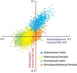 以往研究显示,雄甾二烯酮(androstadienone)和雌甾四烯(estratetraenol)这两种人类类固醇物质具有作为人类性信息素的可能。雄甾二烯酮存在于男性的精液和腋下,可提升女性的情绪状态,对男性却似乎起到相反的作用;雌甾四烯最初发现于女性的尿液中,可提升男性的情绪状态。同时,二者可以基于接收者的性别和性取向激活人类的需求中心——下丘脑。然而,性信息素,顾名思义,应该能够有效地在个体间传递性信息。但对此,之前的研究尚未能提供任何关键性证据。