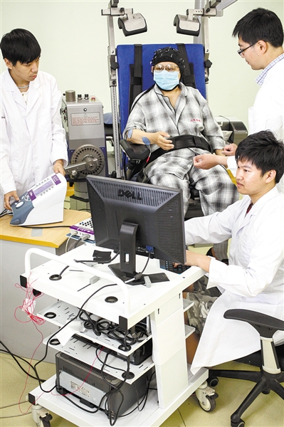 图 6月14日,技术人员在指导因中风偏瘫的董姓患者使用“神工一号”。新华社发(李想摄 中国科技网-科技日报)