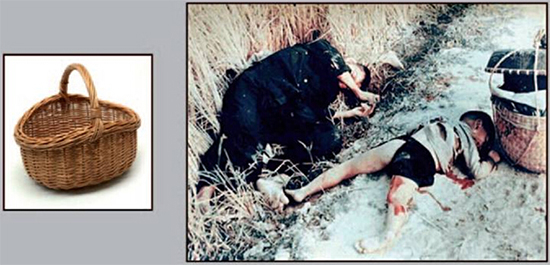 这是一个例子:左侧是作为线索的中立物,篮子。右侧是创伤性场景(已经死亡或受伤的男人和孩子)图片来源Küpper et al. 2014