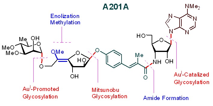 中国科学院上海有机化学研究所生命有机化学国家重点实验室俞飚课题组近期完成了A201A的首次全合成(J. Am. Chem. Soc. 2014, 136, 4157−4160)。该合成采用线性合成策略,通过对5个砌块的糖苷化和酰胺化完成拼接。其中通过Mitsunobu糖苷化高立体选择性地实现了呋喃糖1,2-顺式糖苷键的构建;通过优化条件立体选择性地实现了E式烯醇甲醚的合成;通过该课题组发展的一价金促进的糖苷化反应实现了嘌呤的N-糖苷化;并实现了对含有酸性敏感基团和碱性氮原子的复杂底物的糖苷化。这种线性和模块化的合成策略也为A201A类似物的发散性合成以进行构效关系的研究提供了可能。