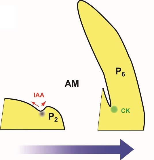中国科学院遗传与发育生物学研究所焦雨铃课题组的研究表明侧生分生组织的形成需要两类经典植物激素的协调调控。在拟南芥中,侧生分生组织形成的叶腋处首先出现生长素的低点,此后叶腋处出现细胞分裂素的活跃信号。该研究进而在拟南芥和番茄中证明:先后发生的生长素低点和细胞分裂素高点都为侧生分生组织的形成所必需。此外,生长素低点的产生依赖于PIN蛋白介导的生长素细胞外运。该工作不仅为侧生分生组织的发生提供了机制上的解释,还发现了一批能够调控侧生分生组织发生的基因。研究获得的结果对于分子育种,特别是作物穗数和穗粒数的调控,有一定借鉴意义。