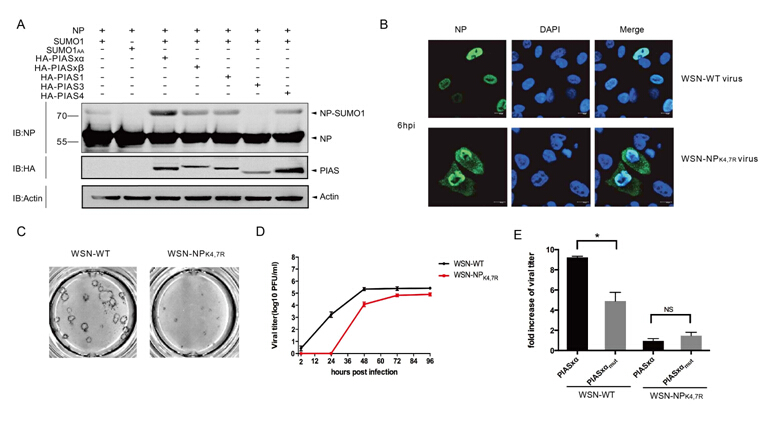 课题组在2010年首次报导流感病毒NS1蛋白可利用宿主翻译后修饰—SUMO化修饰—促进病毒生长(Journal of Virology, 2011,Jan. 85(2):1086–98.),深入研究发现,流感病毒核蛋白NP同样利用人细胞的SUMO修饰系统将自身进行翻译后修饰。NP蛋白是负责病毒基因组复制的重要组成部分,是目前抗病毒药物研发的主要靶点。利用流感病毒反向遗传学系统,研究人员拯救出SUMO化功能缺失的WSN-NPK4,7R病毒,该病毒在病毒生长和空斑形成上都明显减弱,并且存活周期很短,极易发生回复突变,这说明NP的SUMO化修饰对病毒存活和复制至关重要。SUMO化修饰确保了NP蛋白的细胞核内定位,为流感病毒基因组的复制和包装提供必要的时间。研究人员还找到了调控NP蛋白SUMO化的特异性E3酶PIASxa。过表达PIASxa可以显著促进病毒复制,而E3酶活缺失的突变体PIASxamut则对病毒复制没有影响。更为重要的是,NP蛋白的SUMO化修饰在几乎所有亚型的病毒中普遍存在,包括高致病性的H5N1病毒和新近发现的H7N9病毒。该研究不仅揭示了重要的流感病毒致病机理,并且提示了病毒SUMO化修饰可作为开发广谱抗流感病毒药物的潜在靶点。