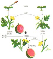 二倍体与四倍体杂交,可以得到“三倍体”。三倍体的减数分裂不正常,不能产生种子。无籽西瓜就是这样杂交得到的三倍体。香蕉是自然产生的三倍体(其祖先也可能是由二倍体与四倍体杂交而来)。