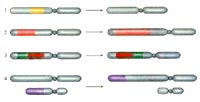 如右图所示,1、缺失(缺失中间黄色所示的一段);2、重复(中间红色所示的一段重复);3、倒位(绿色与红色所示的一段倒转180°);4、易位(下面较短染色体蓝色的一段移接到上面较长的一条染色体上)。