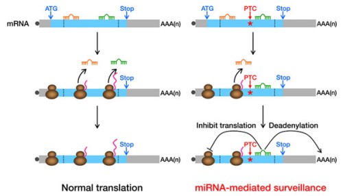 miRNA是真核生物基因组编码的长约22个碱基的非编码小RNA,调控超过三分之一以上基因的表达,参与了包括细胞增殖、分化、凋亡和代谢等几乎所有生命过程,并与多种人类疾病存在重要关联。miRNA与Ago等蛋白质形成RISC复合物,通过碱基互补配对识别位于mRNA 3’非翻译区(3’UTR)的靶位点,促进mRNA的降解并抑制其翻译,是细胞内基因表达调控网络的重要组成部分。在本项研究中,吴立刚研究组博士研究生赵雅等发现,miRNA在细胞内除了调控基因表达外,还扮演了“mRNA质量监控者”这一全新角色,负责识别并清除细胞中的无义突变mRNA,防止功能异常的羧端截短蛋白质给生物体造成危害。