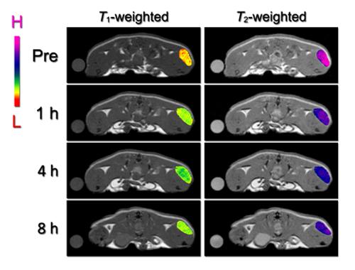最近,在基金委、科技部和科学院的资助下,该课题组深入研究了表面修饰对磁性纳米颗粒弛豫性质的影响机制。他们首先设计合成了三种末端具有不同螯合基团的PEG2000配体,通过配体置换,得到了Fe3O4核心尺寸相同但表面修饰结构不同的生物相容性纳米颗粒。研究发现,配体螯合基团的共轭结构可显著增强Fe3O4纳米颗粒的T2磁共振造影性能。然后结合理论分析,他们深入探讨了配体螯合基团对Fe3O4纳米颗粒的磁共振造影性能的影响机制。一般来讲,减小Fe3O4纳米颗粒的尺寸可有效提高其T1造影性能,但同时会减弱其T2造影效果。然而,利用配体螯合基团效应,在减小纳米颗粒尺寸获得优异T1造影性能的同时,可最大限度地保持小尺寸Fe3O4纳米颗粒的T2造影效果。最后,利用异羟肟酸PEG修饰的3.6 nm Fe3O4纳米颗粒作为磁共振造影剂,成功实现了活体肿瘤的T1和T2双模态磁共振成像检测。相关研究工作已经在近期被接受发表,见Adv. Mater., 2014, 26(17), 2694-2698.(化学研究所)