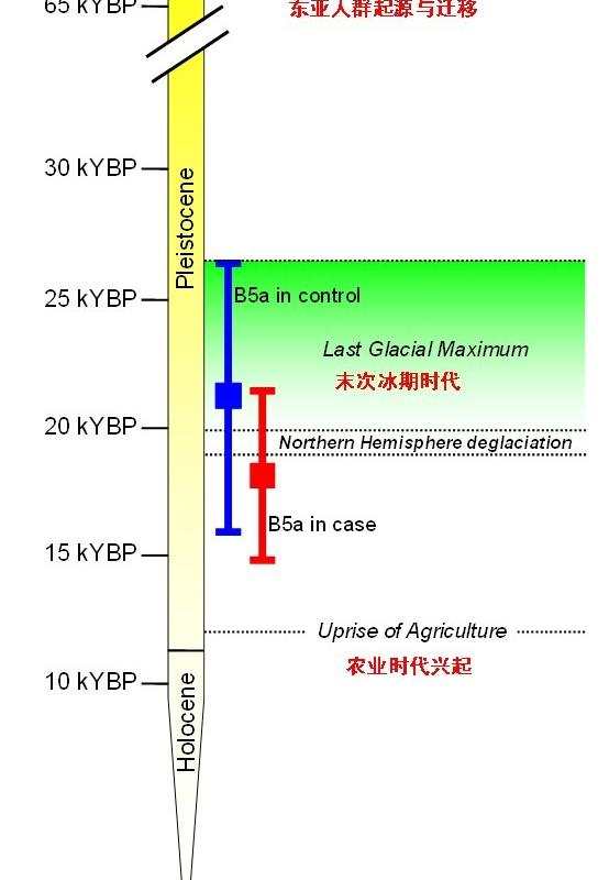中国科学院昆明动物研究所姚永刚研究员团队与中南大学附属湘雅二医院陈晓岗团队合作,从进化医学视角出发,针对湖南汉族精神分裂症患者和无关对照个体开展了线粒体遗传背景的关联分析,发现线粒体遗传背景(单倍型类群)B5a与精神分裂症显著关联。基于患者和对照人群B5a分别进行年龄估算显示,患者群体中B5a的年龄(18317±3271年)比对照群体中B5a的年轻(21403±5295年)。这一年龄方面的差异刚好与末次冰期事件时间比较吻合:患者群体中B5a的年龄处于末次盛冰期晚期,彼时北半球正经历冰川融化与海平面不断上升等气候环境的巨大变迁,经历过这次变迁的B5a群体适应了新环境,但获得了精神分裂症遗传易感的风险。