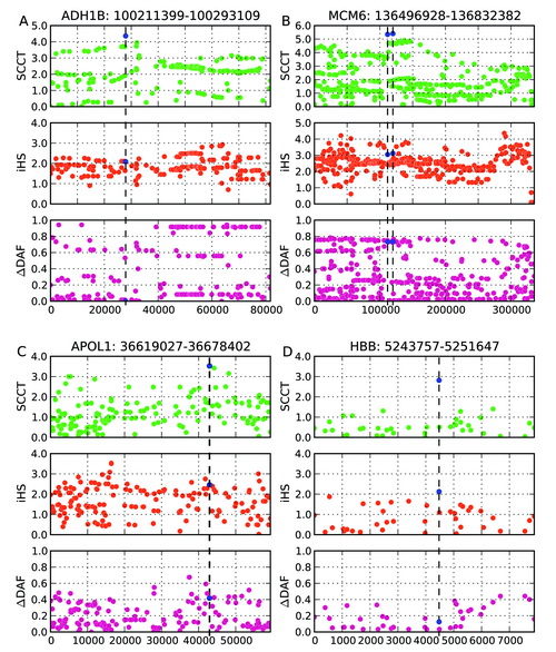 在何云刚和金力的指导下,汪敏先基于条件溯祖理论成功建立了新的计算方法,在对受正选择的关键遗传变异的识别和准确定位上有所突破。新方法的定位准确率较之前的方法提高了约20——40%,统计效力及稳健性也获得明显改善。实例研究中,新的计算方法准确识别了ADH1B、MCM6、APOL1和HBB基因中已得到生物学实验证实的关键基因突变(如图)。这样精确的定位能力为深入开展“正选择”有关的生物学功能研究带来了极大便利。新方法的计算速度远远领先于最流行的正选择检查方法iHS,因而非常适合用于大规模高通量测序数据分析。该研究工作得到了来自国家自然科学基金委和中国科学院的基金支持。(上海生命科学研究院)