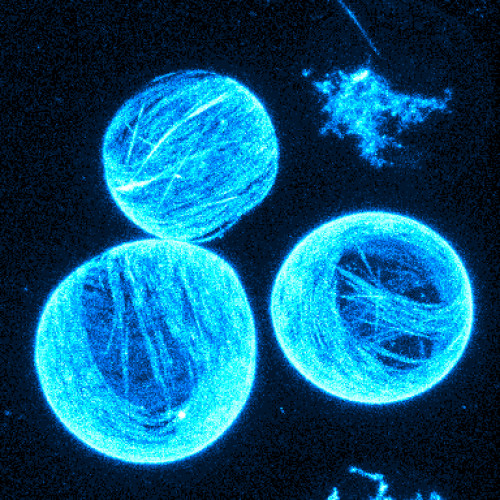 对人造细胞构造变形起着决定性作用的是——即使处于休息状态——液晶也必须包含断层。数学家利用Poincaré-Hopf定理解释了这种现象,后者也被称为“毛球问题”。正如一个人不做出乱发蓬时就无法梳平毛球,总有一些微管无法以规则的形式平躺在细胞膜表面。在某些位置这些细管可能会彼此垂直——呈现出特定的几何学样式。由于慕尼黑研究学者实验中的微管因驱动蛋白分子的活动而彼此处于持续的运动中,断层就会移动。令人惊讶的是,这种移动以非常统一和周期性的方式进行,在两个固定的方向振荡。