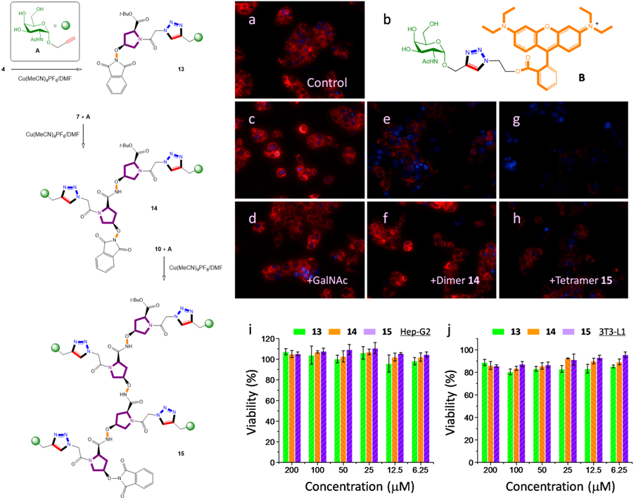 基于对肝癌细胞表面脱唾液酸糖蛋白受体(ASGP-R)靶向检测的前期基础(Adv. Mater. 2013, 25, 4097,专利公开号:CN 103145777 A;Sci. Rep. 2013, 3, 2293,专利公开号:CN 102875623 A;Anal. Chem. 2014, 86, 5502),中国科学院上海药物研究所李佳研究组与华东理工大学陈国荣教授、贺晓鹏副研究员合作,针对传统酰胺肽骨架易被酶解且水溶性差的问题,合成了稳定、高水溶性的氨氧肽骨架,并应用“点击化学”发展了基于此类新骨架的多价乙酰氨基半乳糖肽模拟物。利用乙酰氨基半乳糖罗丹名染料分子实现了对多价糖肽与ASGP-R拮抗作用的荧光标记,为活细胞跨膜受体与配体作用的原位检测提供了新的光学方法;同时证明了此类化合物具备潜在的血清稳定性(不易被酶解)且细胞毒性低的性质,为糖疫苗的研发提供了新的核心骨架。相关工作发表于Nature出版集团刊物Scientific Reports, 2014, 4, 5513(IF 5.078)。