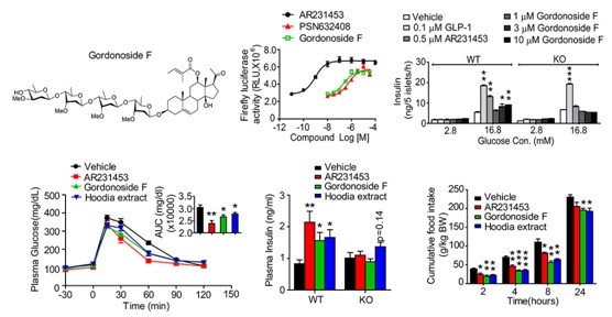 研究团队通过大量化合物筛选发现一个提取自蝴蝶亚的化合物Gordonoside F,而不是原先报道的P57,可以特异性激活与代谢密切相关的G蛋白偶联受体GPR119。Gordonoside F的成功全合成使研究人员可以在动物体内考察其活性。Gordonoside F通过激活GPR119刺激胰高血糖素样肽-1(GLP-1)和胰岛素的分泌,并抑制小鼠食欲。