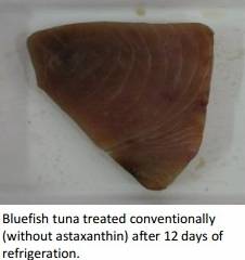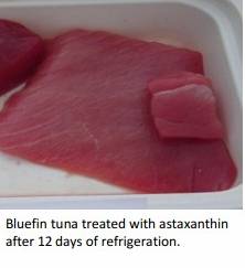 图为使用天然虾青素浸泡过的同一条金枪鱼在冰箱中12天的变化情况,上图未用虾青素浸泡,下图使用了虾青素浸泡。