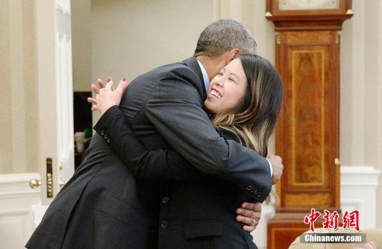 当地时间2014年10月24日,美国华盛顿,美国首位在本土感染埃博拉病毒的牙医护士范尼娜痊愈出院,获得奥巴马接见。奥巴马与其拥抱庆祝。图片来源:CFP视觉中国