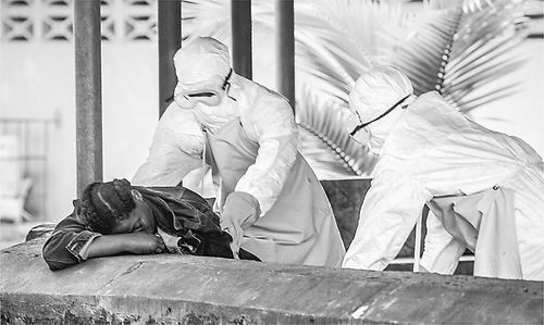 利比里亚护士移走医院外的死者。图片来源:EPA