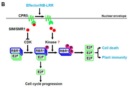 植物的天生免疫系统分为病原相关分子模式诱导的免疫(PTI)和病原菌效应子诱导的免疫(ETI)。ETI是植物的一种主要的免疫反应,由植物NLR受体识别病原菌效应子后激发的,常常伴随超敏反应(HR),又称细胞凋亡(PCD)。植物与哺乳动物的天生免疫NLR受体的结构相似,两者被激活后都引起PCD和免疫反应。哺乳动物的NLR受体引起的细胞凋亡由半胱天冬酶(caspase)执行,半胱天冬酶的表达受P53和E2F两个转录因子调控。可是植物既没有P53也没有半胱天冬酶的同源蛋白,那么NLR受体是如何激活植物PCD和ETI呢?研究人员采用遗传分析研究拟南芥核膜蛋白CPR5的信号传递途径,发现细胞周期的CKI-RB-E2F核心信号链控制植物的效应子激活的PCD和免疫反应。通常CKI抑制RB的磷酸化,但在病原微生物侵染过程中,CKI促进RB的超磷酸化,从而过度释放E2F转录因子,激活PCD和免疫反应。