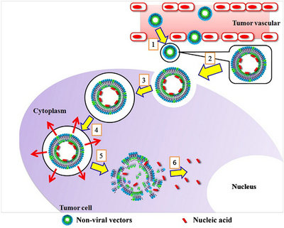 基因药物输递体系输送示意图(以肿瘤细胞为例):(1)扩散通过血管内皮细胞,(2)在细胞处聚集,(3)细胞内吞,(4)和(5)溶酶体逃逸,(6)释放基因药物。