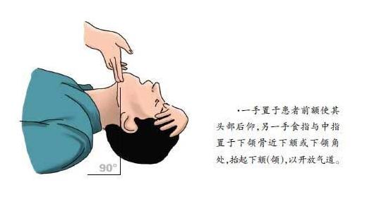 昏迷时,人的舌头会下坠,容易把自己的气道堵死。可用仰头抬颏法开放气道,并清除病人口中的异物和呕吐物。方法是一手放于病人前额,用手掌把额头用力向后推,另一手的掌心放在病人下颏骨处,使其牙关紧咬,下颏向上抬。