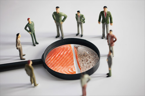 ▲切成片后,仅凭肉眼很难分清养殖的虹鳟鱼和大西洋 鲑鱼 (图片来自网络)