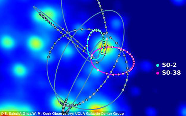 图为两颗银河系近核区恒星的运行轨迹图。目前研究组正期待2018年夏季的到来,因为那是一颗编号为S0-2的近核区恒星最接近银河中心超大质量黑洞的时机。