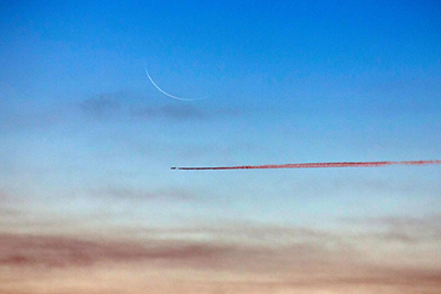 2月5日,云南会泽,飞机掠过小寒清晨的残月。待秋摄