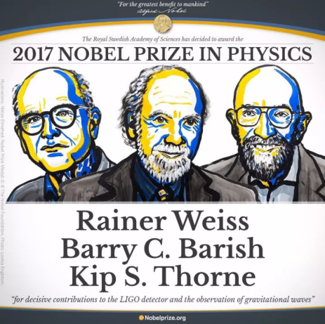 10月3日,瑞典皇家科学院将诺贝尔物理学奖颁给了激光干涉引力波天文台(LIGO)团队的核心成员雷纳·韦斯(Rainer Weiss)、巴里·巴里什(Barry Clark Barish)和基普·索恩(Kip Stephen Thorne),以表彰他们在LIGO探测器和引力波观测方面的决定性贡献,其中,韦斯获得一半奖金(450万瑞典克朗),巴里什和索恩分享另外一半。