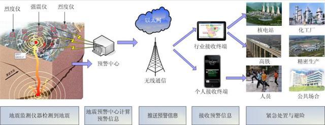 其中地震烈度速报是依托广泛分布的地震台网,在震后数分钟内快速确定地震影响范围和程度,尽快掌握灾情严重程度和分布状况;地震预警是依托震中附近的密集地震台网,在震后数秒内快速估算地震影响范围和程度,抢在破坏性地震波到达目标地之前发布警报。
