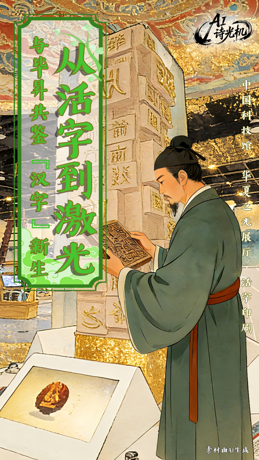 现在,就让我们一起在华夏之光展厅“活字印刷”展品前驻足——北宋发明家毕昇,即将从中现身,带你乘上“诗光机”,开启一场关于“文字与传播”的跨时空对话。