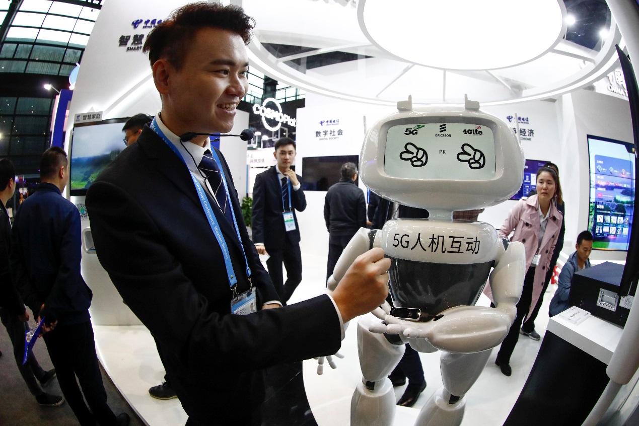 机器人将成为5G时代杀手级应用。图为2018年11月7日,在浙江乌镇举行的第五届世界互联网大会“互联网之光”博览会会场内,一台5G人机互动机器人与工作人员玩起了“猜拳”的游戏,迅速的反应让参观者吃惊。