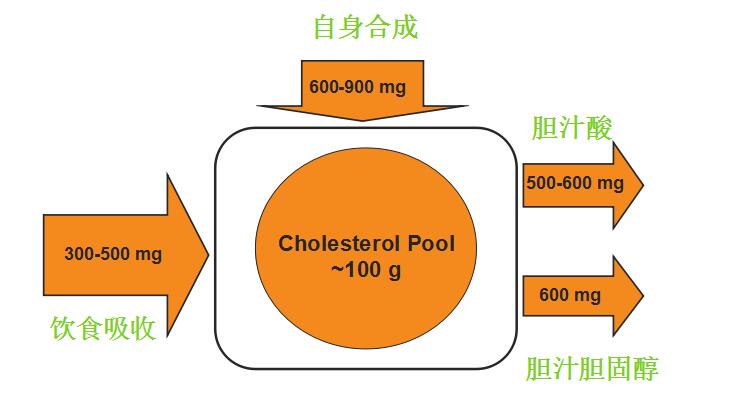 对一个个体来说,我们的身体里总共有约100多克的胆固醇,这些胆固醇会随着每天的新陈代谢而变化。我们每天在食物中摄取的胆固醇大概300-500mg,由肝脏合成的胆固醇约600-900mg,很多胆固醇随着胆汁排出去了或者被转变为胆汁酸。