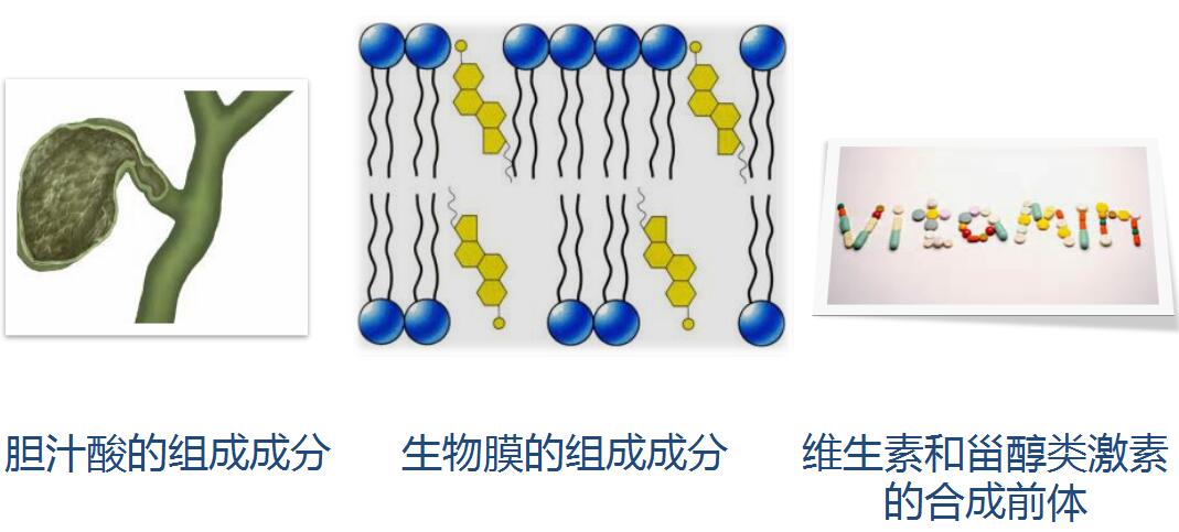 说了这么多高胆固醇的危害,那么胆固醇是不是都是不好的呢?其实,胆固醇不仅不都是坏的,还是人体中不可取少的重要角色。首先,胆固醇的主要功能是在细胞膜上调节膜的基本性质。不仅是人类,其他的动植物也有类似胆固醇的物质在细胞膜上调节它的性质,只有这样细胞才能有正常的生命活动。另外,人体还利用胆固醇来合成胆汁酸,胆汁酸从胆囊分泌到肠道中,把食物中脂溶性的物质乳化,肠道才能把它吸收。比如一些脂溶性的营养物质,像脂肪酸、脂溶性维生素等。如果把小白鼠的胆汁酸合成功能去掉的话,它将无法摄取营养,一出生就会死掉。此外,人体还用胆固醇作为原料来合成一些维生素和一些甾醇类激素,比如雌激素、雄激素等。