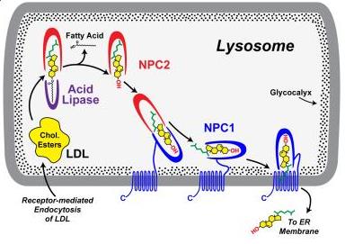 尼曼皮克C疾病与两个基因的突变有关,这两个基因分别是NPC1和NPC2。在胆固醇运送到溶酶体后,NPC1和NPC2就会起作用,完成胆固醇的运输。如果这两个基因发生了突变,胆固醇将无法运出,而堆积在溶酶体中,引起尼曼皮克C疾病。