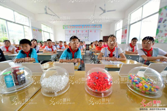 6月26日,湖北省保康县城关镇小学学生在观看毒品样本。杨韬摄/光明图片
