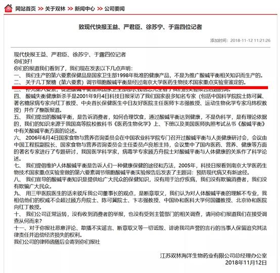 在Young的审判结果引发国内关注之时,梁双林的公司在11月12日列出了11条声明,特别强调:他们的理论得到了多位知名专家的肯定; 酸碱平衡不是伪科学,理论体系来自教科书;他们是卖保健品,提供保健知识并不是治疗疾病;公司目前在正常运转等。