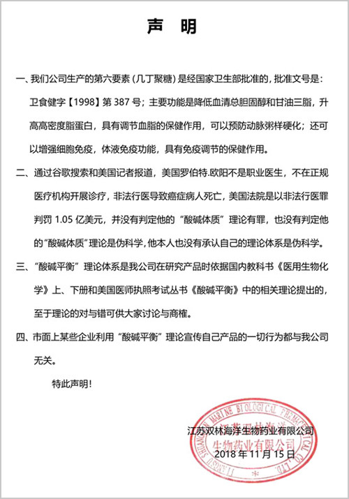 梁双林在解释“酸碱平衡”概念时,提到他在做甲壳素研究时,发现了这类物质对很多疾病有帮助,“这类物质上有碱性的基团”。2005年时,他与南京大学医药生物技术国家重点实验室进行了“几丁聚糖(甲壳素的脱乙酰基产物)调节细胞酸碱平衡”的实验。而几丁聚糖,正是如今梁双林公司开发的保健品“第六要素”的主要成分。