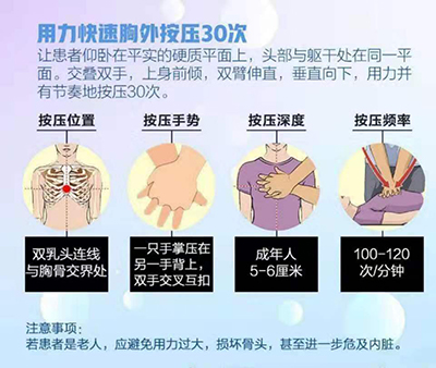 若遇到患者心脏病发作,继之失去反应且无呼吸或仅有濒死喘息,即为心脏骤停。应先呼叫 120 急救电话,并在急救人员指导下给予心肺复苏(从胸外按压开始,胸外按压与人工呼吸比为30:2)。(张梦凡)